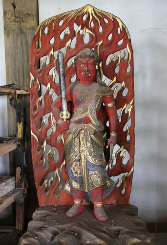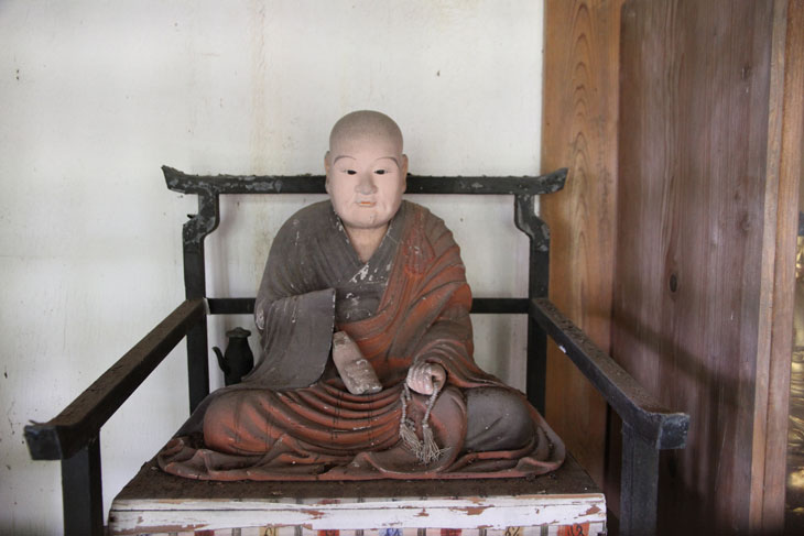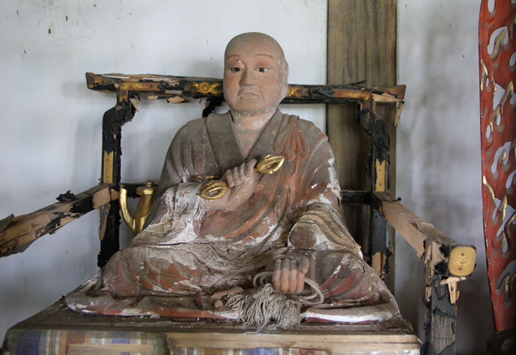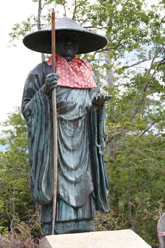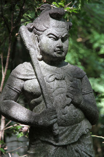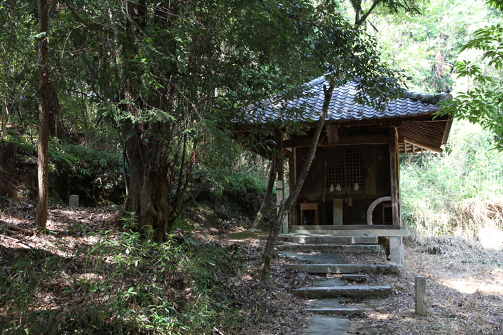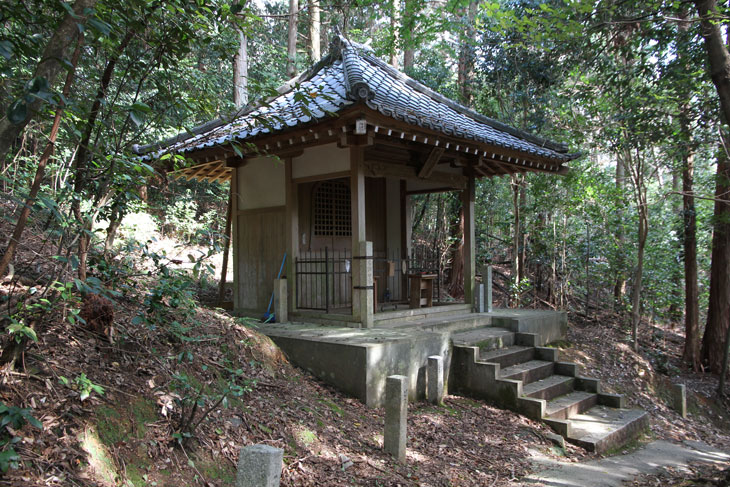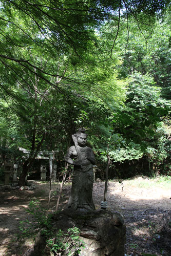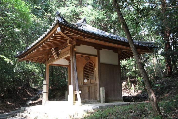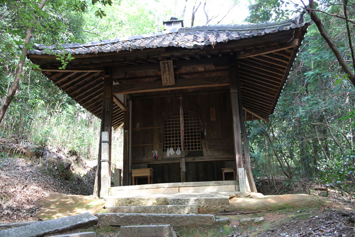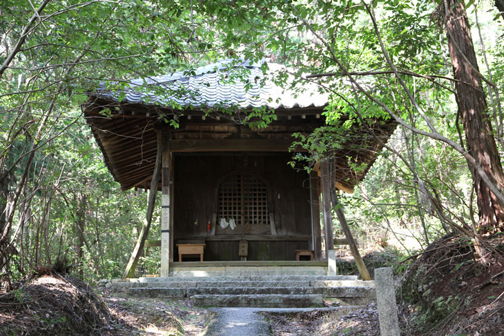 In den Hügeln hinter dem Tempel befindet sich ein Miniatur-Pilgerpfad, der mit seinen kleinen Stationen den Kannon-Pilgerweg auf Shikoku nachbildet und Hachi-ju-hak-kasho genannt wird (hachi = 8, hachi-ju = 80, kasho = Heiligtum, Tempelstation, Angleichung von hachi zu hak). Dieser Pfad dient als Miniatur-Ersatz für den 1200 km langen echten Pilgerweg. Die kleinen Tempelchen sind ganz unterschiedlich, die meisten auf quadratischem Grundriß mit kleiner Vorhalle und mit Pyramidendach, ausnahmsweise kommen auch mal sechseckige Grundrisse vor. Der Erhaltungszustand variiert. Die älteren sind komplett aus Holz. Einige davon sind baufällig, manche sehr, sehr baufällig und lehnen sich gerade noch so auf ihre schiefen Pfosten. Verwitterung und Verfall erzeugen eine gewisse Morbidität. Die Natur holt sich wieder, was ihr gehört, und gerade deswegen ist es schön, immer wieder Spuren frischer Aufmerksamkeit wie Blumen, frische Devotionalien o. ä. an den Andachtsstätten zu sehen. Die Architektur ist schlicht. Die neueren sind aus modernen Materialien auf Betonplattform und haben entsprechend weniger Charme. Durch ein kleines Gitterchen kann man ins Innere spähen, und es lohnt sich, das systematisch zu machen, es ist immer wieder eine Überraschung wie bei einem Adventskalender, was sich dahinter verbirgt. Große Kunst wird man hier nicht finden, eher das Niveau von Volkskunst, aber nett anzuschauen sind die kleinen Figuren im Inneren allemal. Man kann Medizin-Buddhas, Jizo-Figuren, Kannon-Figuren, Darstellungen von Fudo Myo-o oder berühmte Mönche identifizieren. Manche Tempelchen haben auch zwei oder noch mehr Figuren im Inneren, die besseren sogar in einem kleinen Glaskasten.