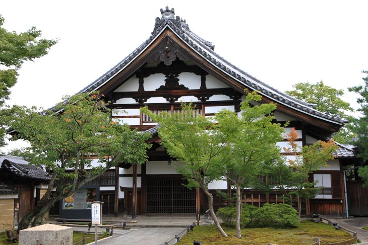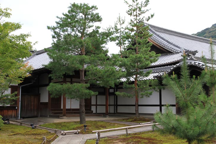 Der Besucher betritt das Gelände am Kuri, dessen Giebelfassade den hinter dem San-mon nach Norden abknickenden Zuweg abschließt. Der Weg führt links um das Gebäude herum. Nördlich des Kuri liegt das gelb angestrichene und mit Ziegeln gedeckte Teehaus (Chashitsu) Kogetsu-an, an den sich das Teehaus Onigawara-seki anschließt. An den Kuri schließt sich im Osten der Hojo (die Abtsresidenz) an. Der Hojo ist eine schlichte Rekonstruktion aus der Taisho-Zeit und wurde erst 1912 errichtet, nachdem der Vorgängerbau Dai-Hojo, der für seine opulente Gestaltung mit Lack und Gold berühmt war, 1847 abgebrannt war. Der Neubau hat hingegen schlichtes Holz. In diesem Gebäude wird das Hauptkultbild aufbewahrt, der Shaka Nyorai. Der aus der Burg Fushimi als Residenz für Nene hierher gebrachte Keisho goten (Palast zum Ankleiden) wurde später zum Ko-Hojo, dem kleinen Abtsquartier. Auch dieses Gebäude fiel 1847 einem Brand zum Opfer.
