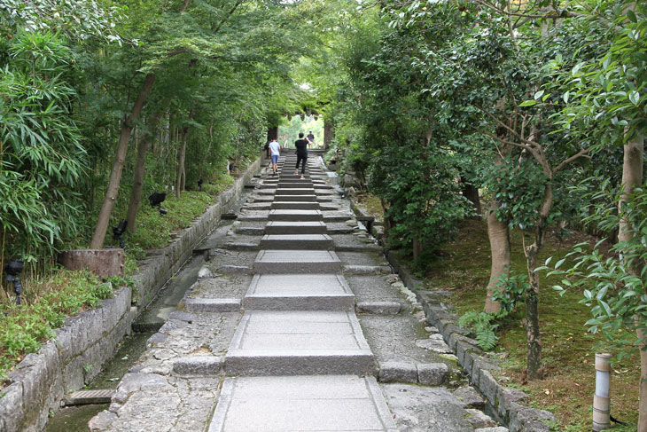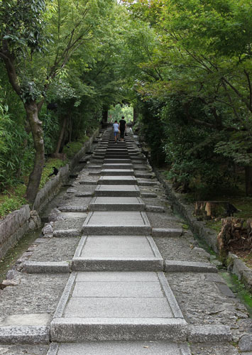 Es fällt auf, wie viele Teehäuser hier insgesamt auf dem Tempelareal zu finden sind, das ist eine Erinnerung daran, daß Toyotomi Hideyoshi ein großer Anhänger des Teekultes war und selbst gerne Teezeremonien durchführte. Mit diesen beiden Teehäusern hat man auch fast schon die östliche Begrenzung des Tempelgeländes erreicht; ein steiler und bewaldeter Hang führt dahinter hoch zum Ryozen Gokoku-Schrein, und von den östlichen Gartenbereichen hat man einen schönen Blick auf die Anlage und die Stadt. Umgekehrt führt der immer stärker werdende Geländeanstieg von West nach Ost zu einer geschickt in die Gartengestaltung eingebauten Höhendynamisierung. Auf dem Weg zurück passiert man ein kleines Bambuswäldchen.