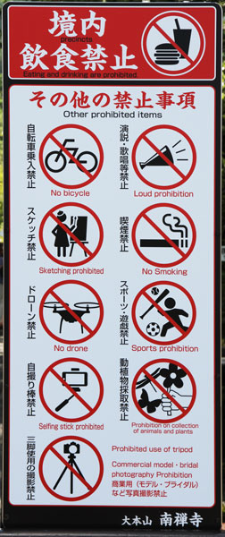 Kleines Beispiel: Dieses Verbotsschild gilt nicht für einen Banktresor oder das Stammheimer Gefängnis, sondern für die Außen(!)anlagen des Tempels Nanzen-ji in Kyoto, also außerhalb des eintrittsgeldpflichtigen Bereiches. Selbst das Zeichnen oder Malen, eine der beschaulichsten, harmlosesten und am wenigsten Schaden anrichtenden Tätigkeiten überhaupt, ist hier verboten, dazu so ganz schlimme Dinge wie Brautphotos durch Photographen machen lassen oder Selfiesticks benutzen. Und in der Sommerhitze an die Wasserflasche gehen geht auch überhaupt nicht! Wohlgemerkt, wir reden von den Parkanlagen, nicht von Innenräumen.