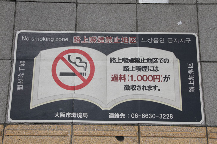 Nichtraucherzone auf der Straße: Wer hier im Außenbereich vor dem Bahnhof Tennoji beim Rauchen erwischt wird, zahlt eine Strafe von 1000 Yen (ca. 8 ). Das Umweltbüro der Stadt Osaka hat diese Bodenmarkierungen im öffentlichen Raum auf dem Gehweg anbringen lassen.