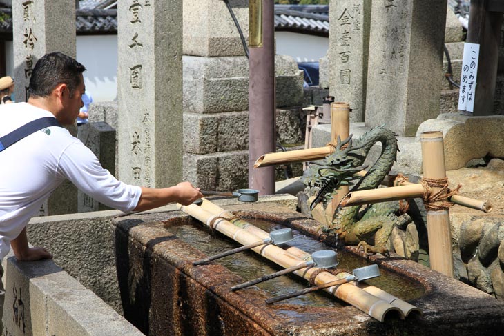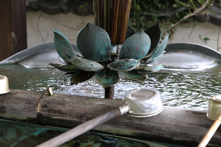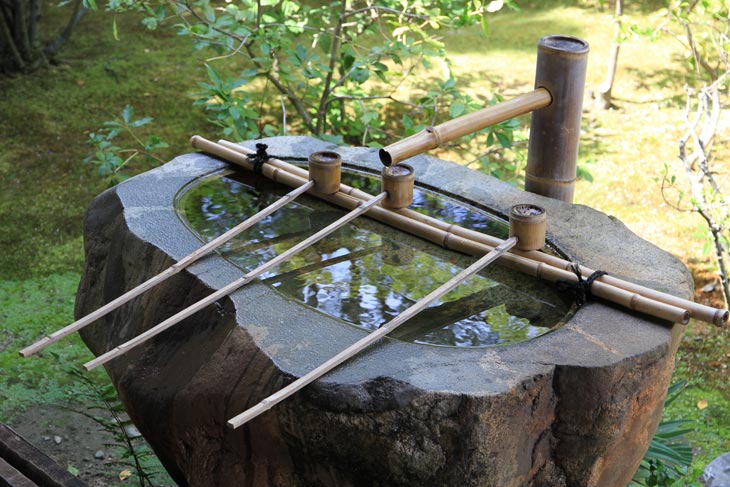 Frisches Wasser wird entweder durch ein Bambusrohr oder aus einem bronzenen oder kupfernen Drachen zugeführt. Es liegen spezielle Schöpfkellen bereit, traditionell aus Bambus angefertigt. Moderne Schöpfkellen sind aber auch aus Aluminium oder schon aus den Bambus imitierendem Kunststoff gefertigt. Damit schöpft man das Wasser, um sich Hände und Mund zu waschen - erst wird das Wasser mit der Kelle nacheinander über beide Hände gegossen, erst mit der rechten über die linke, dann umgekehrt, dann wird mit der Kelle in der rechten Hand etwas Wasser in die linke Hand gefüllt, um sich damit den Mund zu spülen. Danach hält man den Stab der Schöpfkelle senkrecht, damit das verbleibende Wasser den Griffstiel herunterrinnt und diesen säubert, ehe die Kelle zurückgelegt wird, entweder quer über das Becken oder bei größeren Anlagen auf die dafür vorgesehene Ablage, mit der Öffnung nach unten, mit dem Griff nach außen. Diese Reinigungszeremonie nennt man Temizu oder Chozu (Chouzu). Das gebrauchte Wasser fällt außerhalb des Beckens zu Boden, damit das Beckenwasser rein bleibt.