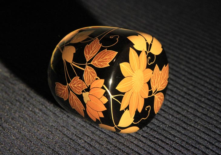 Natsume, Lack auf Holzkörper, zeitgenössische Arbeit aus Kyoto mit Ahornblättern auf schwarzem Grund