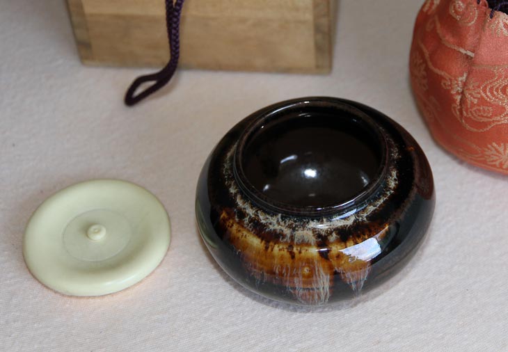 Typisch ist die Aufbewahrung des Teebehälters: Zuerst wird die Deckeldose in ein Brokatsäckchen mit Schnurzug verpackt. Dieses Säckchen nennt man Shifuku, das Webmuster Kireji. Das Ganze kommt dann in ein hölzernes Kästchen mit Deckel, traditionell aus dem Holz der Paulownie (Kiri) angefertigt, einem weichen, leichten, großporigen und leicht zu bearbeitenden Holz. In der Regel signiert der Künstler nicht nur die Keramik am Boden, sondern auch das Holzkästchen, das den Namen in schwarzer Tusche-Kalligraphie und rote Stempel trägt. Chaire, Shifuku und Holzkästchen bilden eine Einheit und werden zusammen verkauft. Die doppelte Verpackung dient nicht nur dem Schutz der dünnwandigen Keramik, sondern bringt auch die hohe Achtung vor dem Kunsthandwerk, vor dem Teepulver darin und die Rafinesse des Teeweges zum Ausdruck.