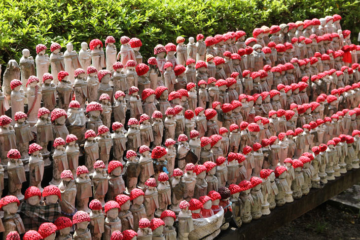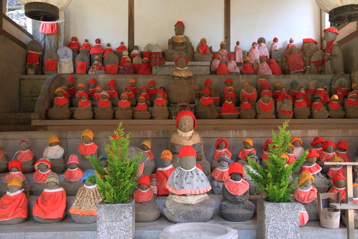 unzählige Jizo-Figuren mit den typischen roten Mützchen und Lätzchen am Subtempel Noman-in des Hasedera in Sakurai.