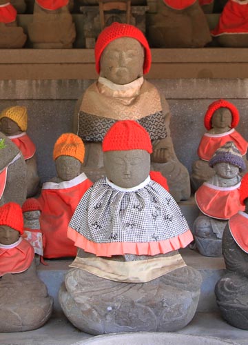 Es muß aber nicht immer gleich ganz schlimm sein und sich um einen Todesfall handeln, wenn wir einen frisch ausgestatteten Jizo sehen - Jizo wird auch verehrt, wenn er offensichtlich ein Kind gerettet hat: Wenn ein Kind schwer erkrankt ist und Jizo heilt, ist das auch ein Dank an den Bodhisattva wert - der auf die gleiche Weise ausgeführt wird: Rotes Lätzchen, rotes Mützchen, Spielzeug - für den uneingeweihten Betrachter ununterscheidbar von den vorerwähnten tragischen Ursachen.