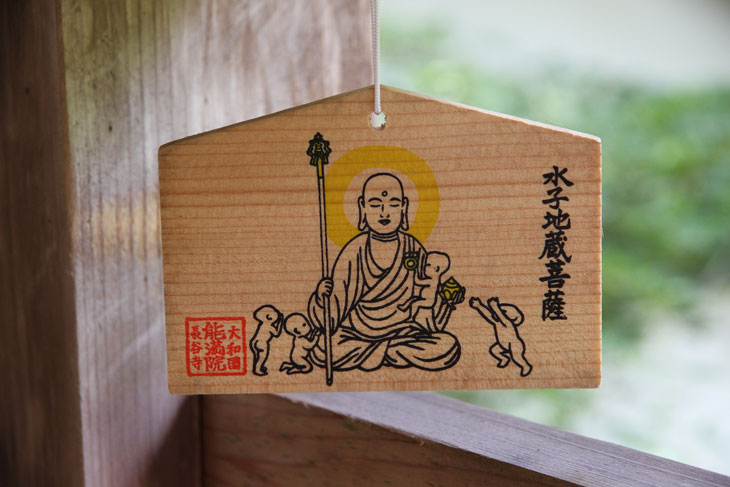 Ema am Subtempel Noman-in des Hasedera in Sakurai: Der rote Stempel verweist auf den Yamato Hasedera und den Subtempel Noman-in. Rechts steht: Mizuko Jizo Bosatsu. Mizu = Wasser, Ko = kodomo, also Wasserkinder. Das ist das Wort für ein totgeborenes Baby, ursprünglich auch für früh verstorbene Kinder.