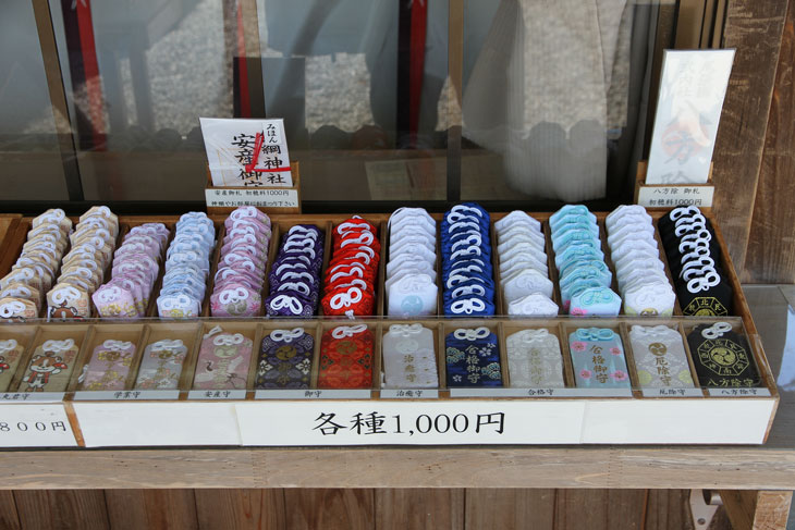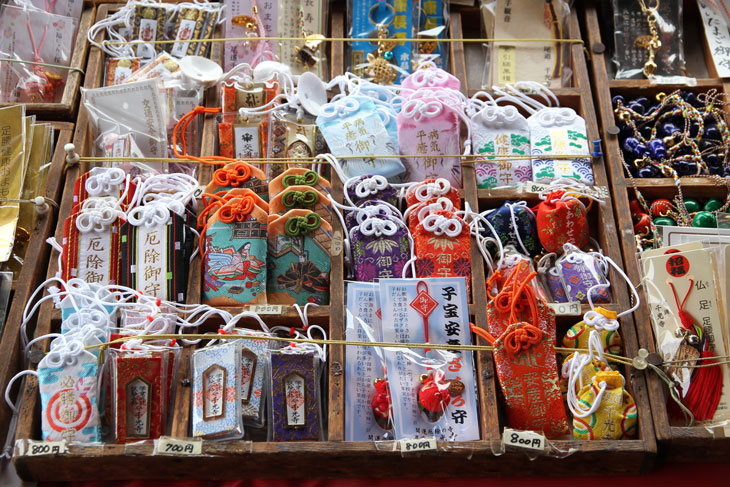Ein typischer Bestandteil der Geschäfte in Tempeln und Schreinen ist der Verkauf von Omamori. Das Wort setzt sich zusammen aus dem Honorativpräfix "O" und dem Wort Mamori, das "Beschützer" bedeutet. Ein "geehrter Beschützer" ist damit ein Talisman, den man in einem Tempel erwirbt. Diese Talismane nimmt man mit nach Hause oder trägt sie ständig bei sich, typischerweise werden sie an der regelmäßig mitgeführten Tasche, am Rucksack, am Handy, am Schlüsselbund, am Geldbeutel, am Autorückspiegel etc. angebunden, um sie ständig mitzuführen, oder zu Hause in Ehren gehalten. Aber eigentlich sind die äußerst populären, traditionell handgearbeiteten, aber aufgrund der hohen Nachfrage zunehmend industriell gefertigten, von einem Priester gesegneten Kleinigkeiten vorrangig als ständiger Begleiter ihres Erwerbers gedacht. Sie werden außen sichtbar getragen, und auch wenn sie dadurch abgeschabt werden oder sie leicht schmutzig werden sollten, tut das der Schutzwirkung keinen Abbruch. Vielmehr zeigt die Patina, was der Talisman alles schon von seinem Träger abgehalten hat. Omamori sind personenbezogen, werden also nur von einer Person benutzt, aber man kann sie auch verschenken, und das tun Japaner gerne. Omamori kosten zwischen 300 und 1500 Yen, also ganz grob 2,80 bis 13 . Für den ausgebenden Tempel bzw. Schrein ist das ein einträgliches Geschäft.