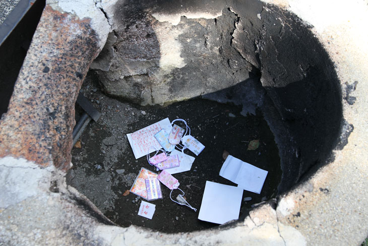 Verfallene Omamori in einem Verbrennungsplatz am Schrein Higashi-Tenno Okazaki-Jinja in Kyoto.