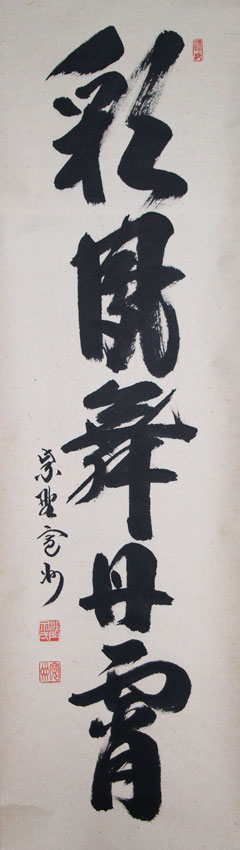 Abb. links: Künstler: Hasegawa Kanshu, Daitoku-ji in Kyoto, Oberpriester des Subtempels Sangen-in. Text: Saiho Tanshoni Mau = Phönix + fliegen + klarer Himmel, bedeutet: Der Phönix fliegt im klaren Himmel, im Sinne des Zen-Buddhismus: Wenn man einen klaren Geist hat, ist man jeder Situation gewachsen und kann das Beste daraus machen. Alter: Showa-Zeit (1926-1989). Signatur: Murasakino Kanshu. Siegel: Kanshu. Hängerolle, handgemalt auf Papier.