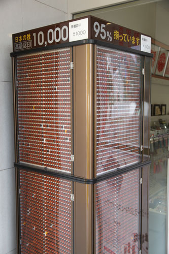 Abb.: In diesem Laden in Banshu Ako (Präf. Hyogo) werden vorgefertigte Stempel von der Stange für die häufigsten Familiennamen angeboten. Einen Hauskauf kann man damit nicht tätigen, aber eine Quittung im Geschäft abstempeln oder eine Lieferung von Waren gegenzeichnen.