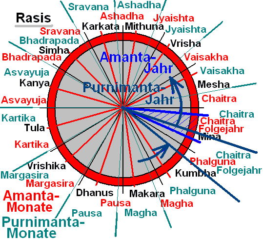 | Besonderheiten, Bemerkungen: | Eine Besonderheit ist der Kshaya-Monat oder "Ausgefallene" Monat wie beim Amantha-Kalender. Ganz selten kann es vorkommen, daß in einen Sonnenjahresmonat KEIN Neu(!)mond fällt. Die Neu(!)monds-Regel gilt für den Amantha- wie für den Purnimantha-Kalender. Das kann der Fall sein bei den kurzen 29-Tages-Monaten, wenn die Erde auf ihrer Umlaufbahn ziemlich nahe an der Sonne ist, also in den kurzen Monaten Agrahayana, Pousha, Magha, entsprechend den kurzen Rasis. Folglich kann auch kein Mondmonat nach diesem Sonnenmonat benannt werden. Der ausfallende Monat ist der Mondmonat, der den Namen nach dem Sonnenmonat trägt, in dem kein Neu(!)mond liegt. Der Abstand, in dem dies vorkommt, ist 19 bis 141 Jahre. |
