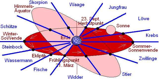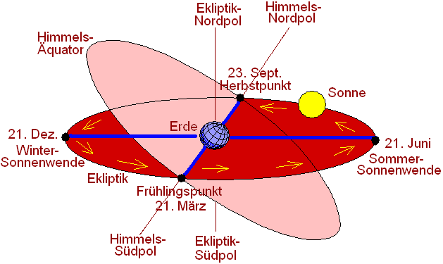 Äquinoktien: Wenn die ekliptische Bahn über dem Himmelsäquator verläuft, sind die Tage länger als die Nächte und umgekehrt. An den beiden Punkten, wo sich Ekliptik und Himmelsäquator schneiden, sind Tag und Nacht gleich lang. Diese Punkte werden Äquinoktien genannt. Es gint eine Frühlings-Äquinoktie am 21. März und eine Herbst-Äquinoktie am 23. September eines Jahres. Die Punkte werden auch Frühlingspunkt und Herbstpunkt genannt.