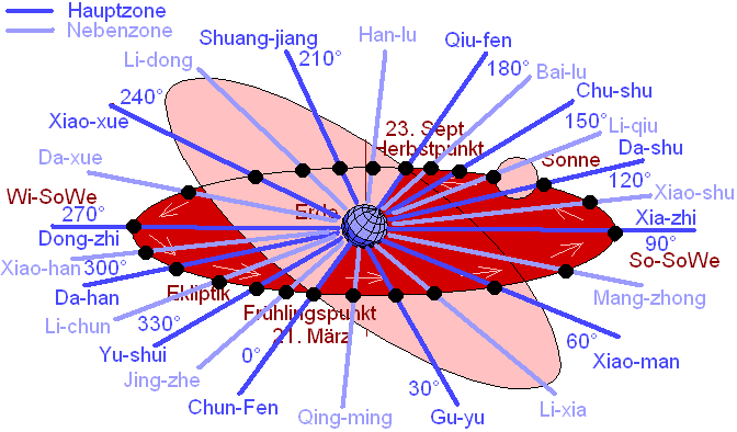 Die chinesischen Jahreszeiten beginnen genau in der Mitte zwischen Tagundnachtgleiche und Sonnenwende (in anderen Kalendern ist das anders, z. B. in Babylonien begannen die Jahreszeiten genau an den Tagundnachtgleichen und an den Sonnenwenden). Der Wechsel der Jahreszeiten korrespondiert nicht mit dem Wechsel eines Tierkreiszeichens, sondern ist um 15° versetzt, denn die Jahreszeiten beginnen nicht mit einer Hauptzone, sondern mit einer Nebenzone.