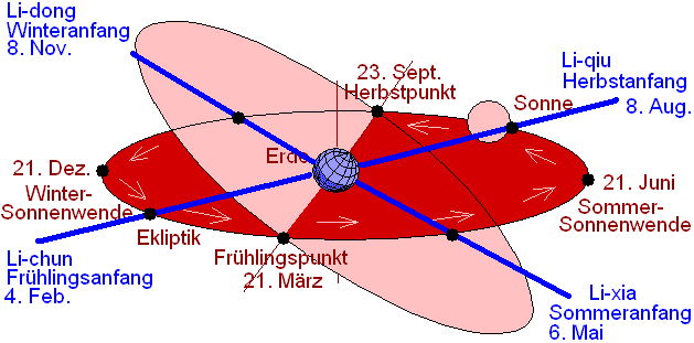 Der Winteranfang hat ferner Einfluß auf die Schaltjahre (s. u.) und bestimmt so den Verlauf des linisolaren Kalenders. Das tropische Sonnenjahr wird im chinesischen Kalender in 24 Perioden (Jie Qi) zu je 15 oder 16 Tagen unterteilt, 12 Hauptzonen (Zhong Qi) und 12 Nebenperioden (Jie Qi), die jeweils 15 Grad der Sonnenlängengrade entsprechen. Die zwölf Zhong Qi teilen die Ekliptik in 12 Teile von jeweils 30°, wobei die Sonnenwenden und die Tagundnachtgleichen vier dieser zwölf Zhong Qi sind (die Graphik ist wegen der Fülle an Text etwas verzerrt). Der selbe Ausdruck "Jie Qi" kann also entweder nur für die Nebenperioden oder aber für alle 24 Eckpunkte des Sonnenjahres stehen. So entstehen wichtige Jahreszeiten-"Marksteine". Klimatisch treffen sie eher für Nordchina als für Südchina zu.