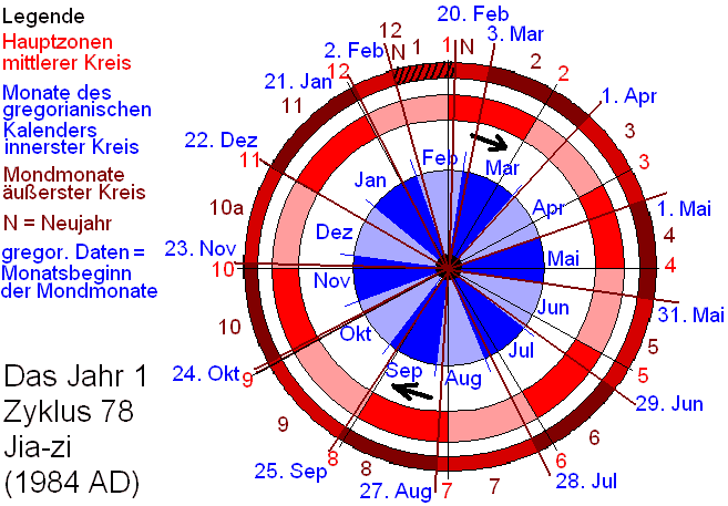 Die Lage der Hauptzonen ist z. T. um einen Tag verschoben, das liegt daran, daß 1984 im gregorianischen Kalender auch ein Schaltjahr war. Es gibt einen Monat ohne Hauptzone, das ist der Monat 10a. Damit ist es ein möglicher Schaltmonat. Die Tatsache, daß ein Monat zwei Hauptzonen enthält, ruft nach einem Schaltjahr. Der 11. Monat liegt ebenfalls nur richtig mit Schaltmonat. Es liegen 12 komplette Mondmonate zwischen dem letzten 11. Monat im Jahr 1983 AD und dem 11. Monat im Jahr 1984 AD, also ist 1984 AD ein Schaltjahr. Der zehnte Tag nach der letzten Wintersonnenwende am 22. Dez 1983 AD war Neumond. Also wird dieses Sui ein Schaltjahr. Dadurch rutscht der Jahresanfang vor, so daß das nächste Neujahr zeitlich später als das das Schaltjahr einleitende Neujahr fällt und sich der äußerste Ring in der Graphik überlappt (schraffierte Zone).