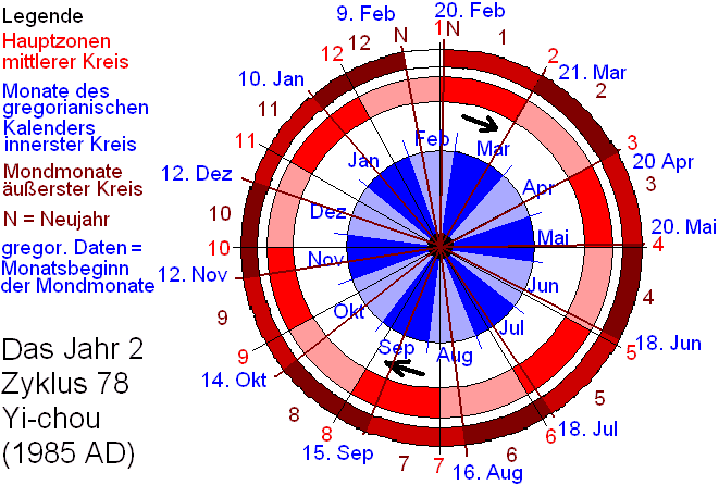 Beispieljahr für ein normales Jahr mit scheinbarem Schaltmonat: 1985 AD, Jahr 2 des Zyklus 78, Jahr Yi-chou