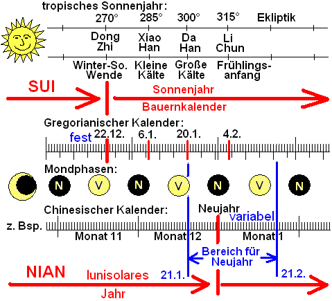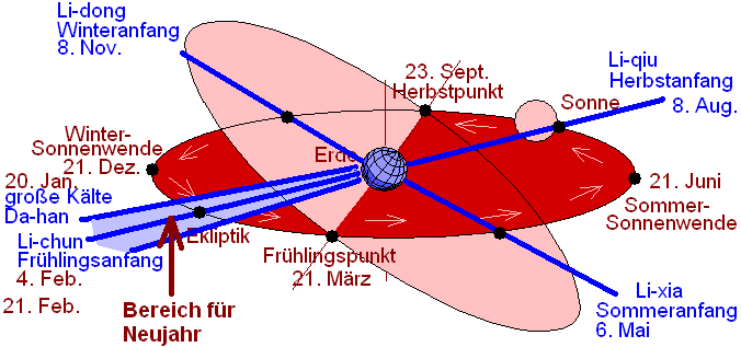 Achtung: Das astrologische Jahr läuft wieder anders: Es beginnt nicht an chinesisch Neujahr und auch nicht an der Wintersonnenwende, sondern an Li-Chun, Frühlingsbeginn, 4. Februar. Damit richtet es sich nach dem Sonnenkalender.