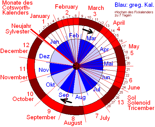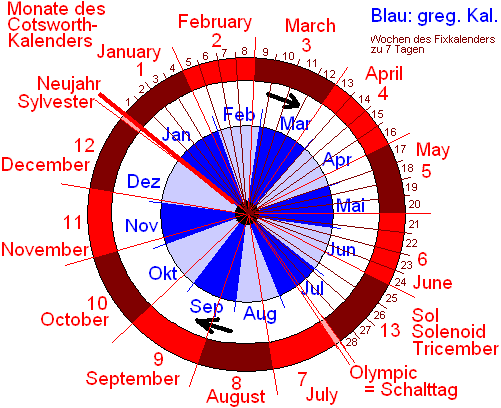 Monate zu je 28 Tagen (13*28 = 364 Tage) 13 Monate zu je genau 4 Wochen (52*7 = 364 Tage) Plus 1 Extratag (Sylvester, Jahrestag, "Year day") außerhalb der Zählung als Extension des Dezembers (in summa 365 Tage)
