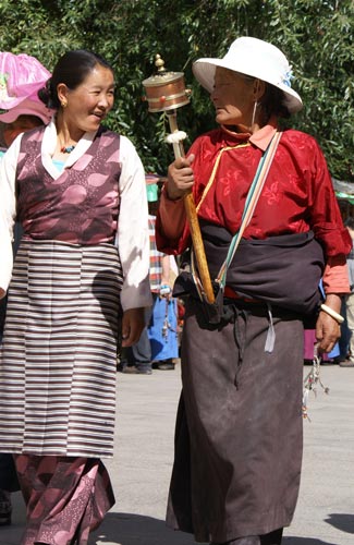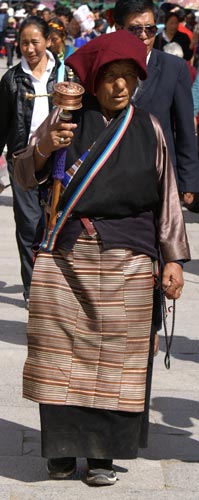 Die einfachste Möglichkeit der Umrundung ist das einfache Schreiten, dabei die Gebetsmühle drehend, wobei jede Umrundung und jede Drehung immer im Uhrzeigersinn erfolgt. Die meisten tragen die Gebetsmühle in der Rechten und einen Rosenkranz in der Linken. Andere wiederum messen die Wegstrecke mit ihrem Körper ab, falten die Hände vor der Stirn, lassen sich auf die Knie nieder, legen sich bäuchlings auf Straßenflaster, Knie und Hände mit Schonern aus Holz, Plastik oder Stoff geschützt, strecken die Arme aus, stehen wieder auf und gehen zur letzten Position der Hände vor, das gleiche wiederholend, bei einer einfachen Umrundung des ca. 500 m langen mittleren Weges sind das immerhin rund 300 Niederwerfungen. Und ganz strenge Pilger messen die Wegstrecke nicht mit ihrer Körperlänge, sondern mit ihrer Körperbreite ab, das wären pro Umrundung weit über tausend Niederwerfungen, eine tagesfüllende Demutsbezeugung und Verehrung rings um das Heiligtum, die die Grenze der Selbstkasteiung der sich wie in Trance wieder und wieder niederwerfenden Menschen überschreitet.