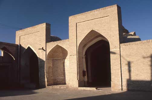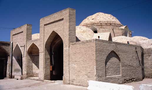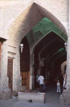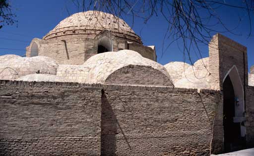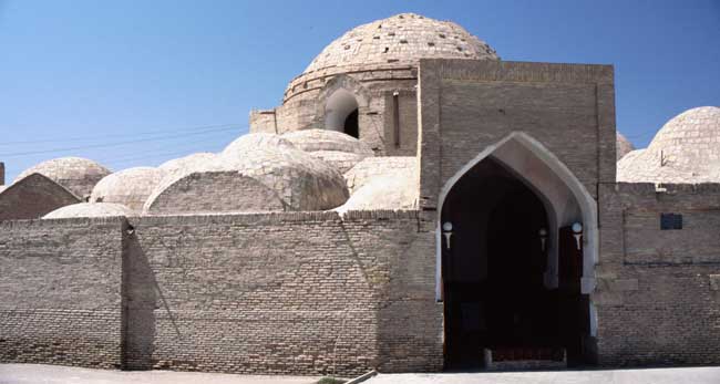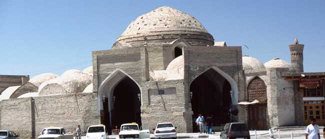 Ein Tak oder Tok bezeichnet eigentlich einen Bogen, aber als pars pro toto auch einen Kuppelbasar, der typischerweise auf einer Straßenkreuzung liegt und diese überwölbt und zugeich mit Handelsgewölben einrahmt. In Bukharas Altstadt sind noch drei solcher Tokis erhalten. Dieses ist der mittlere, der Tok-i-telpak-furushon, das Gewölbe der Mützenmacher. Dieser Kuppelbasar hat einen komplizierten Grundriß, denn hier treffen sich insgesamt fünf Straßen. Nach Norden hat er einen Eingang, nach Südwesten und Südosten je zwei nebeneinander.