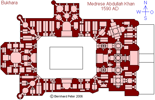 Die Medrese Abdullah Khan folgt vom Typus her dem einer Hof-Medrese mit Studentenzellen und insgesamt vier mittig angeordneten Iwanen. Sie ist größer als ihr Pendant, hat einen wesentlich verzwickteren Grundriß und ist insgesamt komplexer strukturiert. Insbesondere der Verlauf der Außenwand ist sehr unregelmäßig, im Norden und Westen wurde durch großzügige Anbauten Platz für weitere Räume geschaffen. Das stört die Struktur aber nicht weiter, und auch nicht die Regelmäßigkeit der Wahrnehmung vom Innenhof aus. Als islamisches Bauwerk lebt diese Architektur von innen her, von ihrem Zentrum aus, und nicht von einer beliebigen Außenansicht vom Hinterhof her.