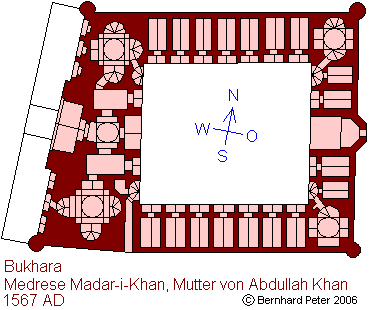 Die Westwand dagegen steht schräg und verzerrt den Grundriß zum Trapez. Der Grund dafür ist, daß die Westfassade parallel zur in Nord-Süd-Richtung verlaufenden und beim Bau schon vorhandenen Straße steht, die Medrese aber wie so viele religiöse Bauwerke ihren Bezugspunkt im Westsüdwesten hat. Dieses Herausdrehen aus der Achse betrifft aber nur den Eingangsbereich, der Iwan zum Hof hin korrespondiert schon wieder mit seinem Gegenüber in der Ostwand, so daß man im Innern des Gebäudes nichts von der trapezoiden Verzerrung merkt.