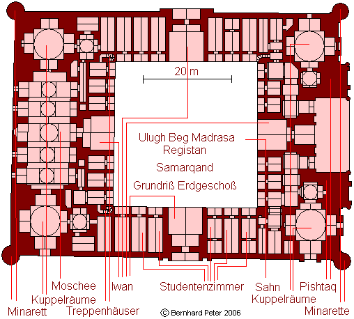 Abb.: Typische Vier-Iwan-Madrasa: Ulugh-Beg-Madrasa in Samarqand, Erdgeschoß
