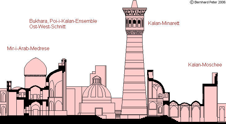 Abb.: Ost-West-Schnitt durch das Ensemble um das Kalan-Minarett. Links im Osten der Eingangs-Iwan zur Mir-i-Arab-Medrese, rechts im Westen der Eingangsbereich der Kalan-Moschee. Der Blick nach Süden fällt auf das wuchtige Kalan-Minarett und die dahinter liegenden Gebäude jüngeren Datums.