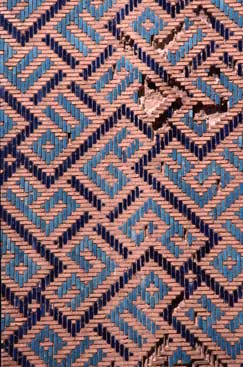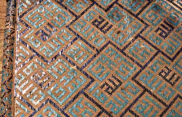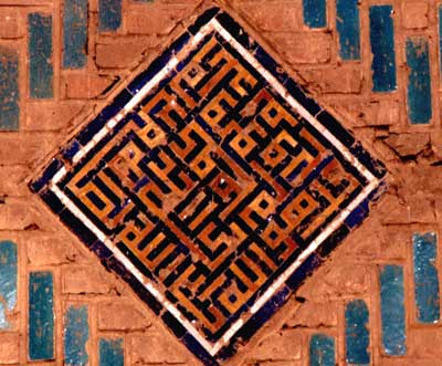 Diese Kalligraphie in geometrischem Kufi stammt aus dem Eingangsbereich der Bibi Khanum, aus der Verkleidung des Iwans. Der Text ist wieder so einprägsam wie simpel - sämtliche Quadrate werden vom Namen "Muhammad" ausgefüllt, die kleinen einmal (in verminderter Linienbreite), die großen Quadrate doppelt. Die breit-kreuzförmigen Strukturen dazwischen enthalten jeweils doppelt "Allah, ja karim, ja 'azim". "Al-karim" ist "der Großzügige" und einer der 99 schönsten Namen Gottes. "Al-'azim" bedeutet "großartig, stark, wichtig, gewaltig", es ist ebenfalls einer der 99 schönsten Namen. Die 99 Namen Gottes (Asma'u-llahi-l-husna) werden als Synonym für Gott verwendet, wobei man sich auf folgendes Hadith (Ausspruch des Propheten Muhammad) beruft: "Wahrlich, Allah hat neunundneunzig Namen, einen weniger als hundert. Wer sie aufzählt geht ins Paradies ein." (Sahih Bukhari). Von den 99 Namen Gottes stehen 84 wörtlich im Koran und werden insgesamt 1.286 Mal erwähnt. Der hundertste Name ist den Menschen nicht bekannt.