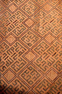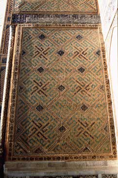Dieses flächige kalligraphische Muster befindet sich auf der Rückseite der Bibi Khanum Moschee auf der Wand der Hauptkuppelraumes. Es ist ebenfalls ein einziges Dhikr (Gedenken) Gottes: Die kleinen Quadrate wechseln sich ab mit "Allah" und "Akbar", zusammen "Allahu akbar" - Gott ist am größten. Die taillierten Rhomben, abwechselnd liegend oder stehend, lauten identisch "subhana-llah wa lillahi-l-hamd" (auch lesbar als "subhana-llah wa-l-hamdu-lillah" ) - Erhaben ist Gott und Gott sei gelobt. Auch diese Kalligraphie vereinigt damit die drei klassischen Elemente des Gottesgedenkens und hat den gleichen Inhalt wie eingangs am Haupteingang erklärt. Ein ganz ähnliches Motiv ist an der Außenwand der Sher Dor Medrese eingelegt.
