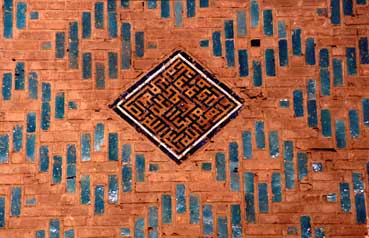Eingebettet in einen größeren Mosaik-Verband aus Ziegeln ist diese kalligraphische Tafel, die in Kufi die komplette Sure 112 (Al-Ichlas) enthält: "Qul huwa-llahu ahad. Allahu samad. Lam jalid wa lam julad wa lam jaku-llahu kufuan ahad" "Sprich: Gott, er ist Einer. Gott ist ein Einziger. Er hat nicht gezeugt und er wurde nicht gezeugt. Und keiner ist ihm gleich."