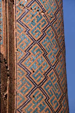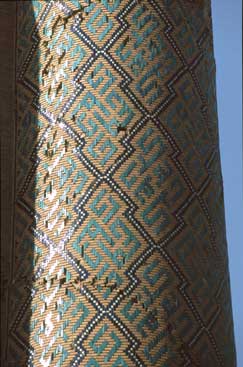 Minarett der Bibi Khanum Moschee. Gemeinsam überziehen verschiedene Vignetten, abwechselnd zu einem Netzwerk vereint, die Minarette. Die Vignetten lauten "ja Rahim" - Oh Gnädiger - bzw. "ja karim" - Oh Großzügiger. Bei der einen Vignette ist "gemogelt" worden, damit sie genau in den gleichen Rahmen paßt - bei den beiden "m" in der Mitte ist insgesamt eine Linienbreite eingespart worden.
