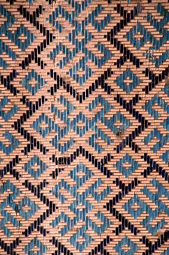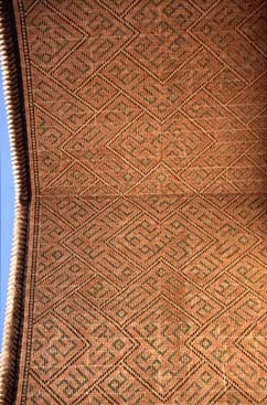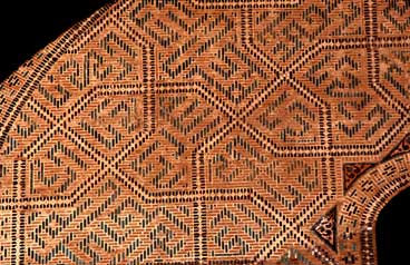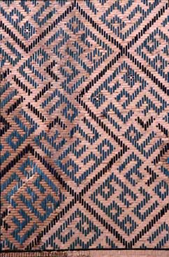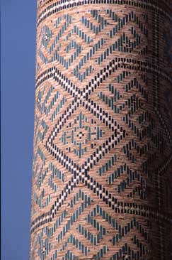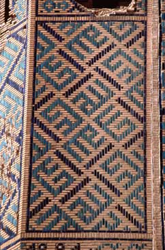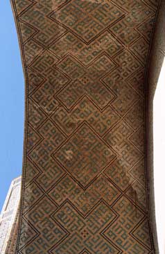 Dieses ist ein Element von der Seite des Hauptpishtaqs der Bibi Khanum Moschee. Es lautet "Allahu akbar" - Gott ist am größten. Weil nur eine kleine Fläche damit geschmückt ist, fällt kaum auf, daß sich das Element schlecht zur flächigen Gesatltung eignet, da Lücken bleiben.