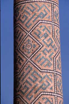 Das gleiche Motiv findet sich auch an der Außenfassade der Sher Dor Medrese in Samarqand. Hier am Haupteingang der Bibi Khanum Moschee ist das Glaubensbekenntnis (Shahada) Programm - denn genau diese beiden Sätze bilden das Bekenntnis jeden Muslims. Wer sich dazu bekennt, wird zum Betreten der Moschee eingeladen, und gleichsam wie ein Filter wirkt diese Schrift, die Eintretenden im Glaubensbekenntnis vereinend und nach außen ein abgrenzendes Bekenntnis ablegend.
