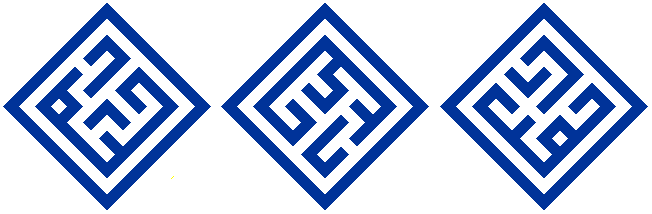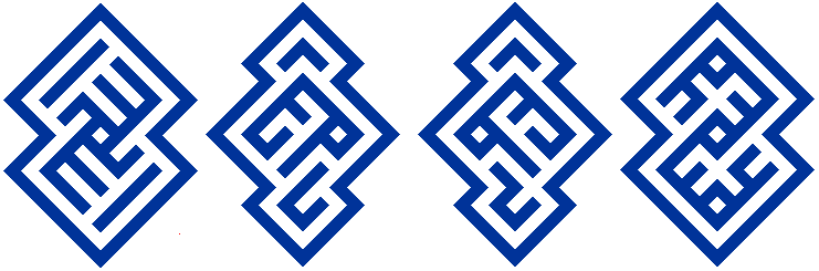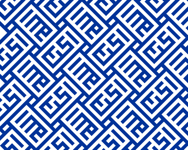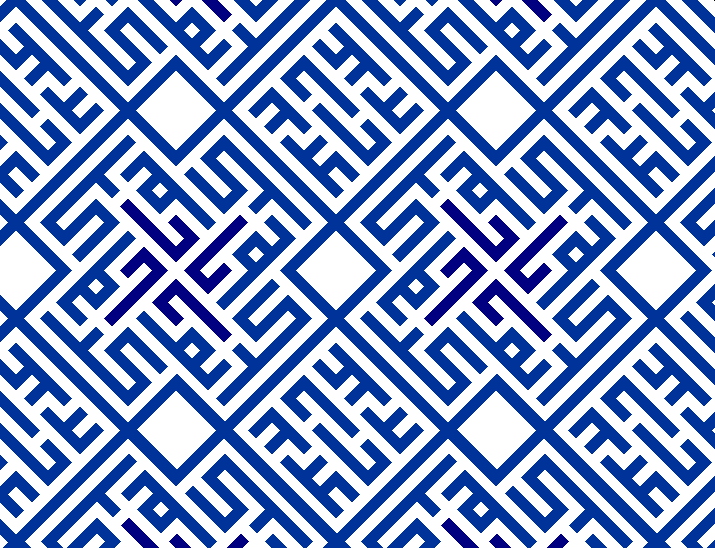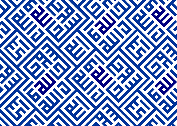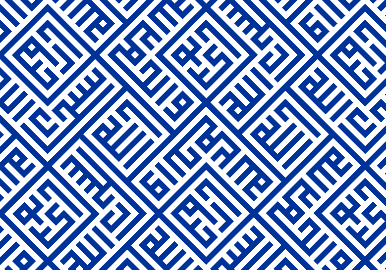 Wieder das vertraute "Allahu akbar" - Gott ist über allem / Gott ist am größten, hier als unendliches Muster gestaltet. Im Gegensatz zu anderen Gestaltungen findet hier ein Versatz von jeweils einer Linienbreite statt, der durch die kleinen Rechtecke ausgeglichen wird. Dadurch wirkt das Ganze noch mehr wie ein Flechtmuster, weil schrägrechte und schräglinke Felder unterschiedliche Spuren für die Farbflächen benutzen.