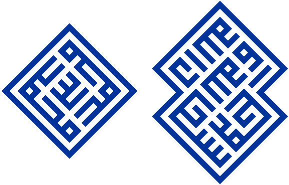 Vignetten aus den Blendnischen der Sher Dor Medrese. Ganz links ist enstanden aus 2x mit dem "h" verbundenen "Allah", ganz rechts aus 2x "Muhammad", beide vom Zentrum her zu lesen, das "m" wird geteilt. In der Mitte zwei verschiedene Varianten des Gottesnamens "Ja Rahim" - Oh Gnädiger.