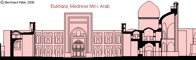 Die Mir-i Arab Medrese ist eines der schönsten Beispiele shaibanidischer Architektur. Sie entstand 1535-1536 AD unter der Regierung von Ubaid-Ullah(1533-1539). Sie hat äußere Abmessungen von 55 m auf 73 m und bildet nach dem Kosh-Prinzip das städtebauliche Gegenstück zur gegenüber liegenden Kalon-Moschee. Sie hat den klassischen Aufbau, Vieriwan-Schema im Innenhof und eine Prachtfassade mit gewaltigem Mitteliwan, zwei Ecktürmen und zwei auf beiden Seitenflügeln angebrachten Kuppeln auf einem Tambour.