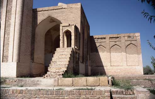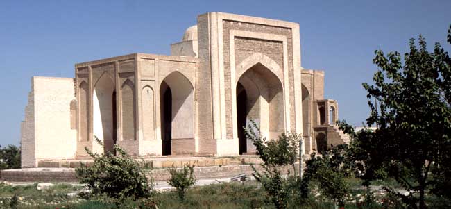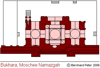 Die Namasgah-Moschee in Bukhara ist im Kern relativ alt. Der älteste Teil war nur eine gegliederte Wand, ist heute in der westlichen Rückwand verbaut und stammt von 1119 AD. Der Mihrab, die Gebetsnische, ist noch aus dieser Zeit. Diese einfache Wand war Begrenzung des 37 x 85m großen Areals.