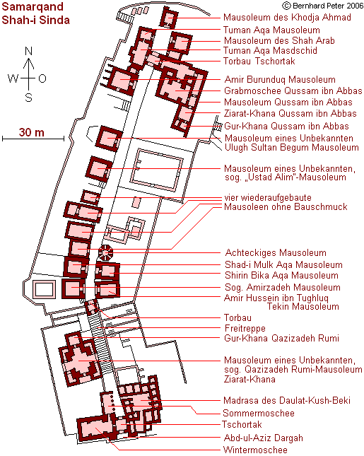 Bei dem Shah-i Sinda-Komplex in Samarqand handelt es sich um eine timuridische Gräberstraße außerhalb der alten Stadt in Afrasiab, deren erste Bauten auf Timurs Zeit zurückgehen, und die unter seinen Nachfolgern mit immer weiteren Bauten ergänzt wurde, so daß man auf engem Raum die Entwicklung der Grabbauten in der Zeit des 14.-15. Jh. hervorragend studieren kann.