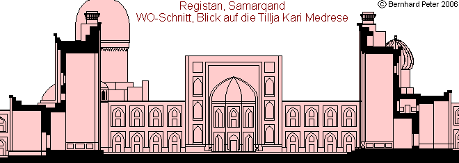 Abb.: West-Ost-Schnitt durch das Registan-Ensemble mit Blick auf die Südfassade der Tillja-Kori-Medrese.