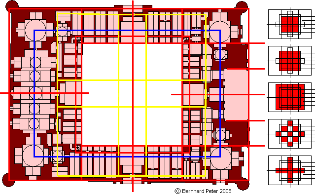 Ausgehend von der realen Medrese könnte man eine ideale Muster-Medrese konstruieren, bei der ein exakt quadratischer Innenhof durch Überschneidung zweier größerer Quadrate gebildet würde (in der realen Medrese sind es keine echten Quadrate).