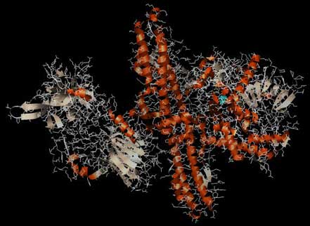 Abb.: 3D-Raumstruktur des Botulinum Neurotoxins B, PDB-ID 1EPW, visualisiert mit Chimera. Orange die Alpha-Helices, silbern die Beta-Faltblattstruktur. Die türkisfarbene Zone im rechten Bereich ist ein Sulfation.