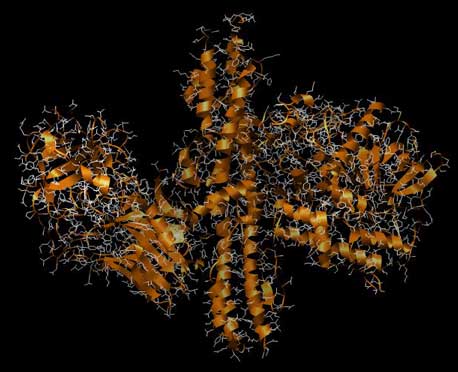 Abb.: 3D-Raumstruktur des Botulinum Neurotoxins Typ A, PDB-ID 3BTA, visualisiert mit Chimera. Gelb die Sekundärstruktur.