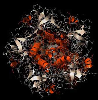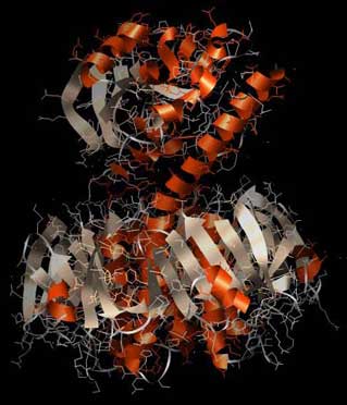 Abb.: 3D-Raumstruktur des Enterotoxins LT von Escherichia coli, PDB-ID 1LTB, visualisiert mit Chimera. Seitenansicht, unten Erkennungsregion, oben eigentliches Gift. Orange die Alpha-Helices, silbern die Beta-Faltblattstruktur