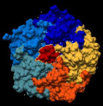 Abb.: 3D-Raumstruktur des Enterotoxins LT von Escherichia coli, PDB-ID 1LTB, visualisiert mit Chimera. Blick von unten auf die Erkennungsregion mit C5-Symmetrie, bestehend aus 5 gleichen Aminosäure-Ketten. In der Oberflächendarstellung ist die Zusammensetzung des Haptomers aus fünf gleichen, aber separaten Aminosäureketten dargestellt. Weiße Punkte sind Wassermoleküle.