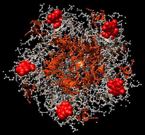 Abb.: 3D-Raumstruktur des Enterotoxins LT von Escherichia coli, PDB-ID 1LTT, visualisiert mit Chimera als Kugel-Stab-Darstellung. Blick von unten auf die Erkennungsregion mit C5-Symmetrie, bestehend aus 5 gleichen Aminosäure-Ketten. Rote Kalotten stellen beispielhaft Zuckerliganden dar.