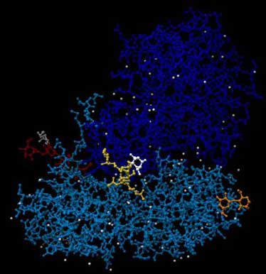 Abb.: 3D-Raumstruktur von Ricin, PDB-ID 2AAI, visualisiert mit Chimera. Seitenansicht auf beide Ketten. Die zwei einzelnen Aminosäureketten sind farblich unterschieden (hellblau ist die B-Kette und dunkelblau die A-Kette), die vier bunten kurzen Teile sind die Zucker.