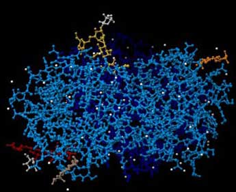 Abb.: 3D-Raumstruktur von Ricin, PDB-ID 2AAI, visualisiert mit Chimera. Blick von unten auf die Erkennungsregion. Die zwei einzelnen Aminosäureketten sind farblich unterschieden (hellblau ist die B-Kette und dunkelblau die A-Kette), die vier bunten kurzen Teile sind die Zucker.