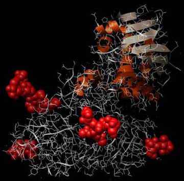 Abb.: 3D-Raumstruktur von Ricin, PDB-ID 2AAI, visualisiert mit Chimera. Seitenansicht, unten die erste Untereinheit, oben die zweite Untereinheit, rote Bereiche sind die Zuckerketten.